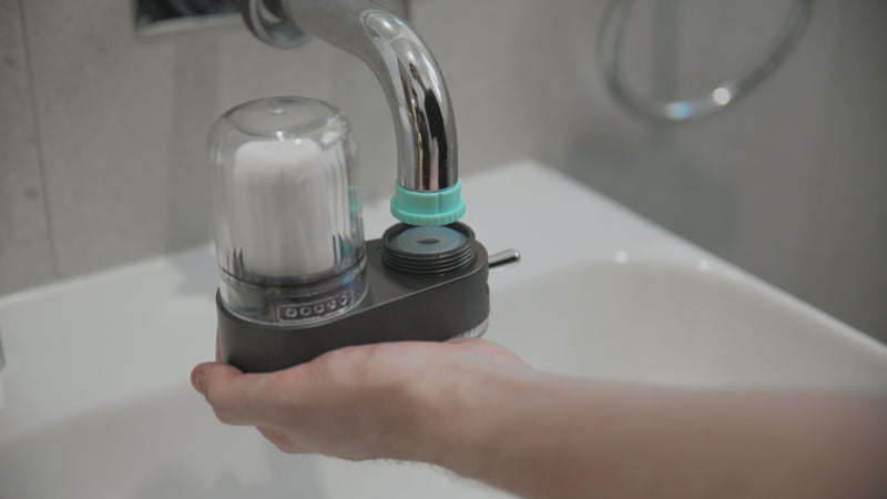 Line up the SafeFlow Tap Filter with the adapter, screw on the top piece, and twist until it is firmly secured
